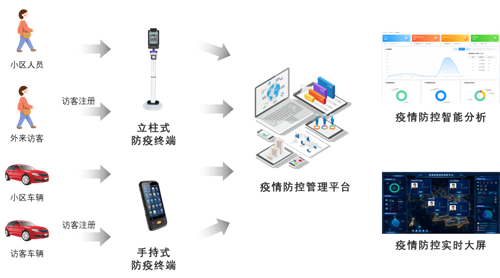 數(shù)字哨兵守護(hù)通行,多模式高效核驗(yàn)。小區(qū)出入口布設(shè)立柱式/手持式數(shù)字哨兵防疫終端,居民、車輛、訪客可進(jìn)行人臉識(shí)別核驗(yàn)、健康碼核驗(yàn)、身份證核驗(yàn)、人證合一核驗(yàn)方式,獲取健康狀態(tài)與行程信息,核驗(yàn)通過(guò)即可進(jìn)出小區(qū)。 對(duì)接管理系統(tǒng),聯(lián)動(dòng)快、指揮靈。前端數(shù)據(jù)統(tǒng)一匯集至疫情防控管理平臺(tái),進(jìn)行分析處理。數(shù)據(jù)大屏實(shí)時(shí)滾動(dòng)健康碼核驗(yàn)數(shù)據(jù),防疫基本情況可視化呈現(xiàn),讓管理人員詳細(xì)了解小區(qū)出入動(dòng)態(tài),實(shí)時(shí)聯(lián)動(dòng),智慧高效。