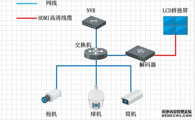 小型的監(jiān)控系統(tǒng)組成非常簡(jiǎn)單,通常就是前端幾個(gè)攝像頭,然后接交換機(jī),交換機(jī)接NVR,NVR直接連接顯示器,直接在顯示器上預(yù)覽畫面,NVR的解碼能力比DVR的解碼能力更強(qiáng),現(xiàn)在普通的NVR都是支持1-8路的1080P的攝像頭解碼,但最近幾年也出現(xiàn)幾款的高端NVR,集成更加強(qiáng)大的解碼功能,但絲毫未改變NVR就是存儲(chǔ)的產(chǎn)品,所以一般通過(guò)NVR顯示,都是應(yīng)用在一些低端,點(diǎn)位數(shù)較小的項(xiàng)目中,比如超市和店鋪這類預(yù)算較低的項(xiàng)目。同DVR顯示一樣,普通的NVR的監(jiān)控上墻也會(huì)遇到畫面切換控制不方便,且不支持視頻畫面開(kāi)窗漫游等功能。